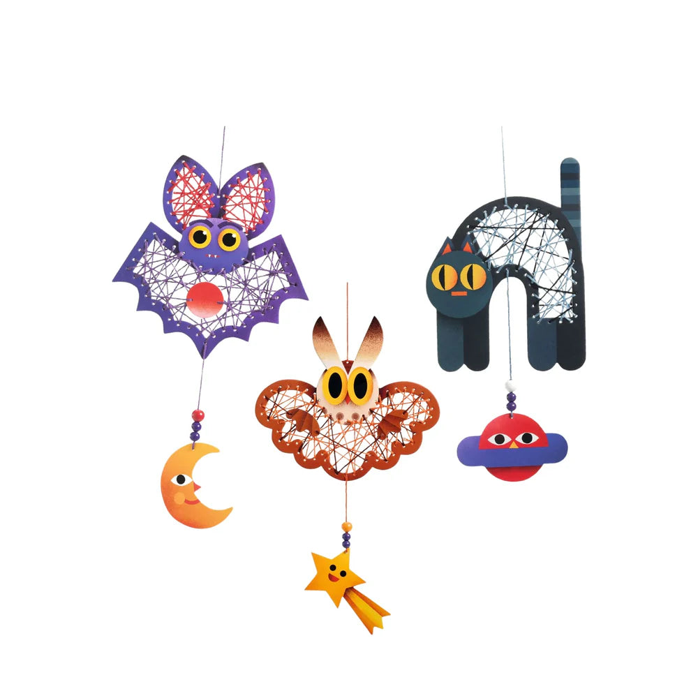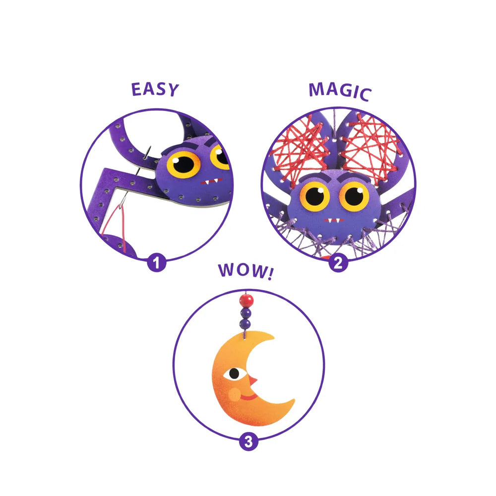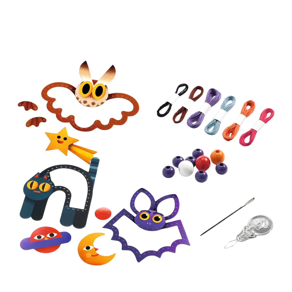 A kit to create 3 night-themed decorative hanging designs. Using the round-tipped needle, slide the string through the pre-punched cards and criss-cross them until each character has a body. Finish off your creations by adding pendants with wooden beads.