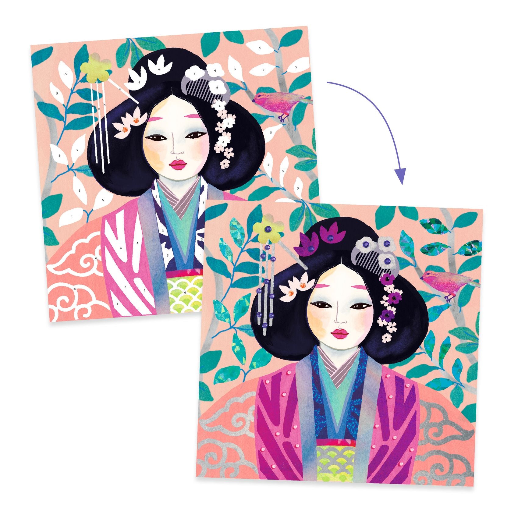 The child can identify the areas to be foiled using the colour code on the boards. They remove the protective film from the pre-glued surface and apply the foil sheet. The material sticks as if by magic! All that’s left is to stick on the rhinestones to make the pictures shine.