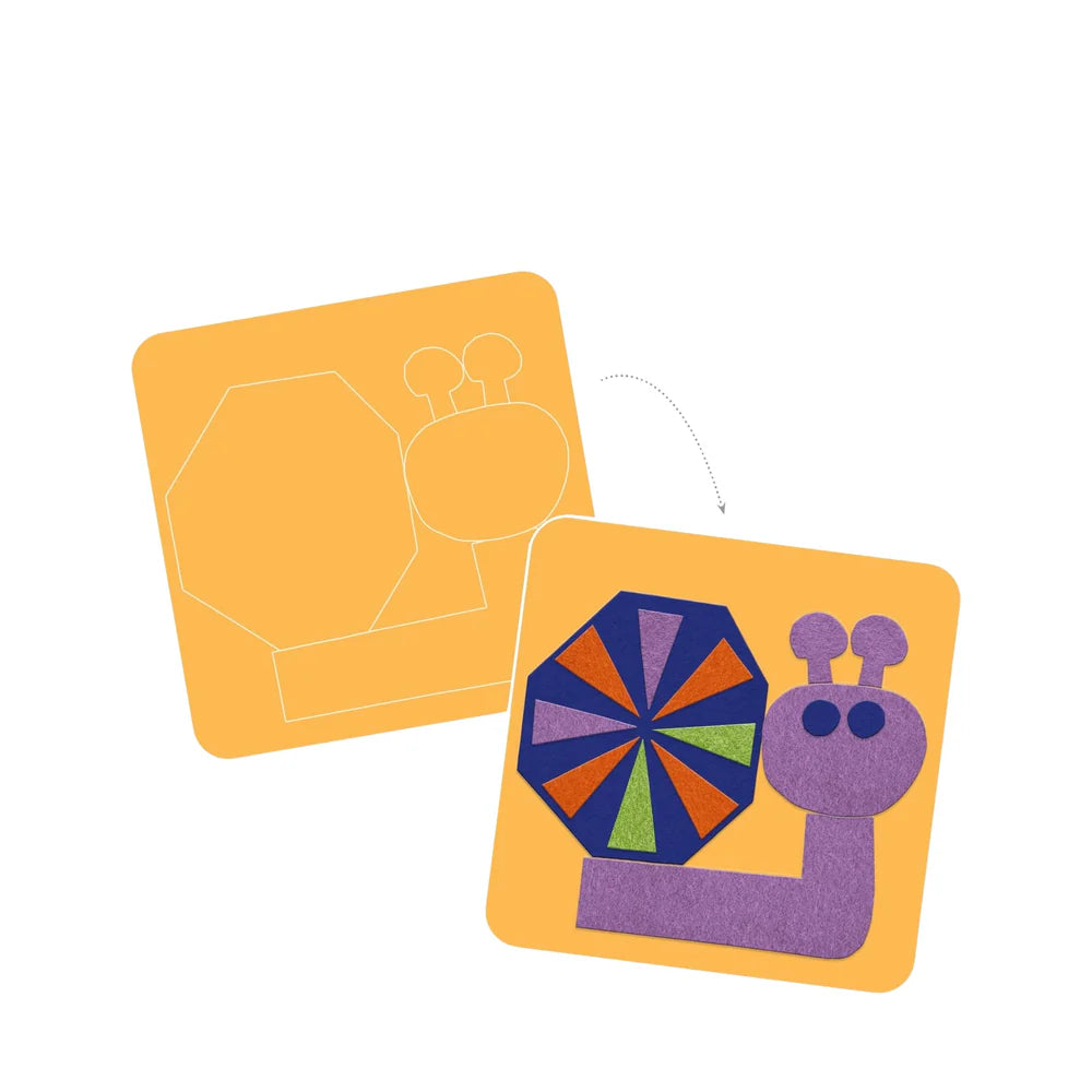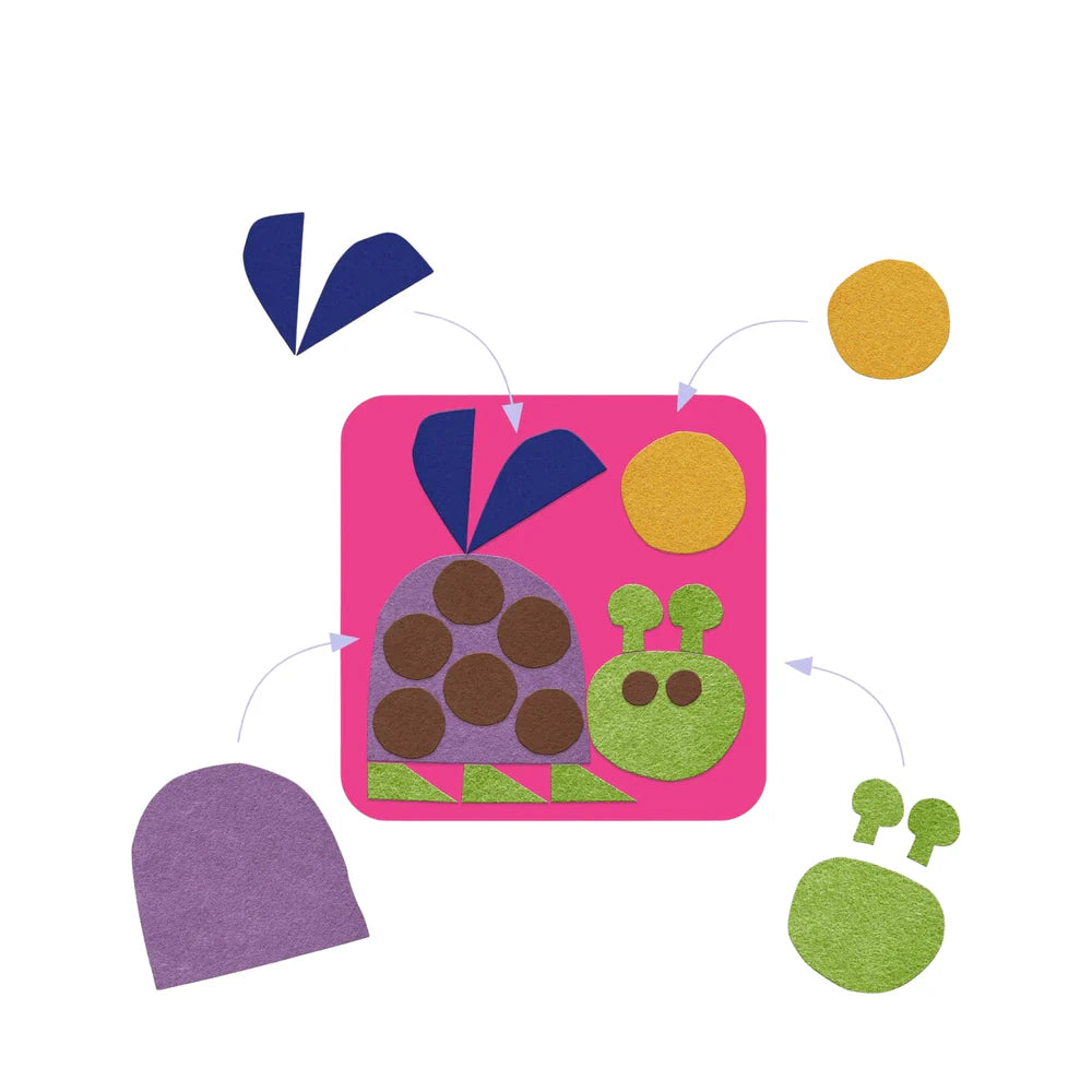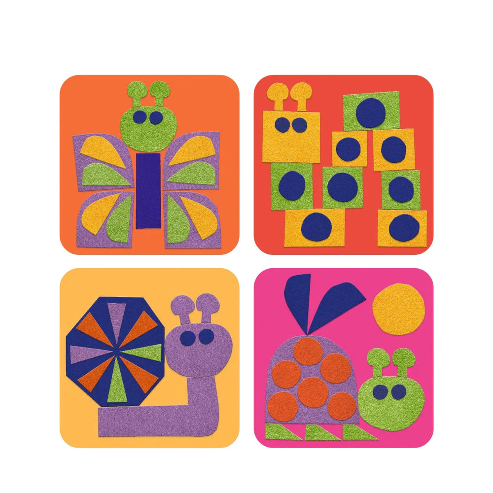 A collage activity for ages 18 months and up. Create 4 pictures with cute little felt stickers. Following the instruction booklet, stick down the felt stickers to form 4 soft, colourful pictures.