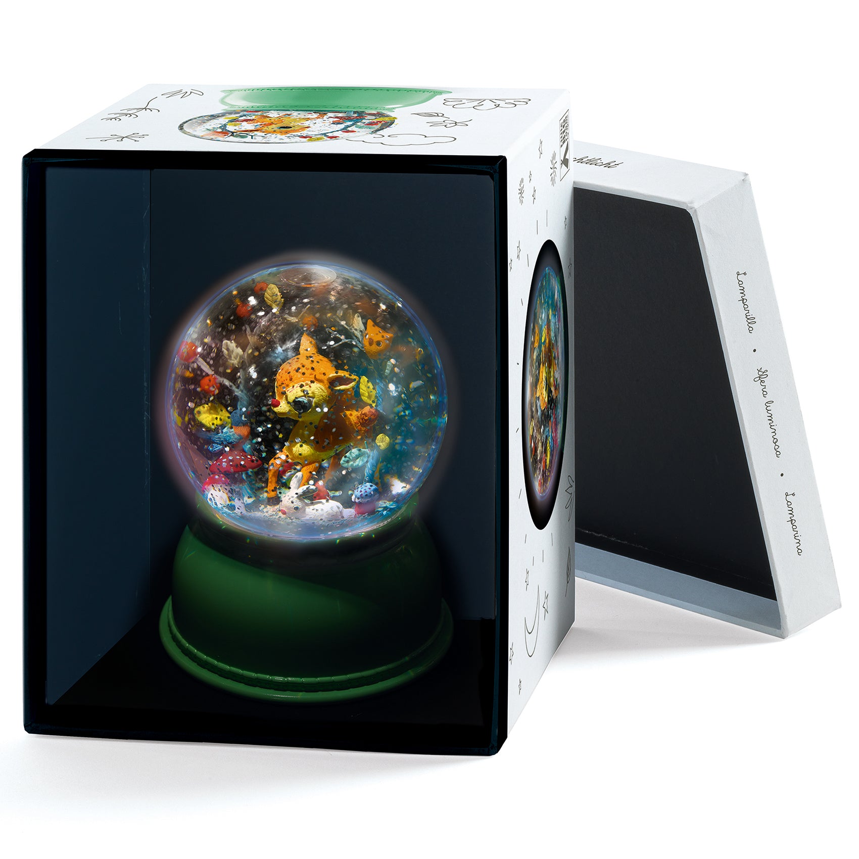 A sparkling snow globe night light with a delightful little fawn. This glitter-filled night light has a silent mechanism that swirls the glitter around and gives off soft light that changes colour. For soft and soothing nights.