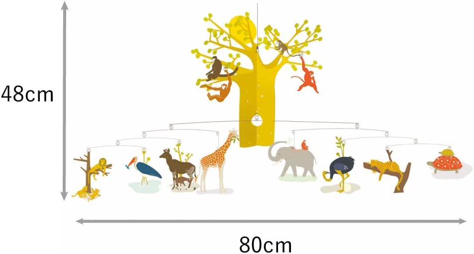 The African Savannah Mobile design features various safari characters centred around a monkey-tastic tree, plus metal rods upon which they hang and gently twirl as the air moves around them.