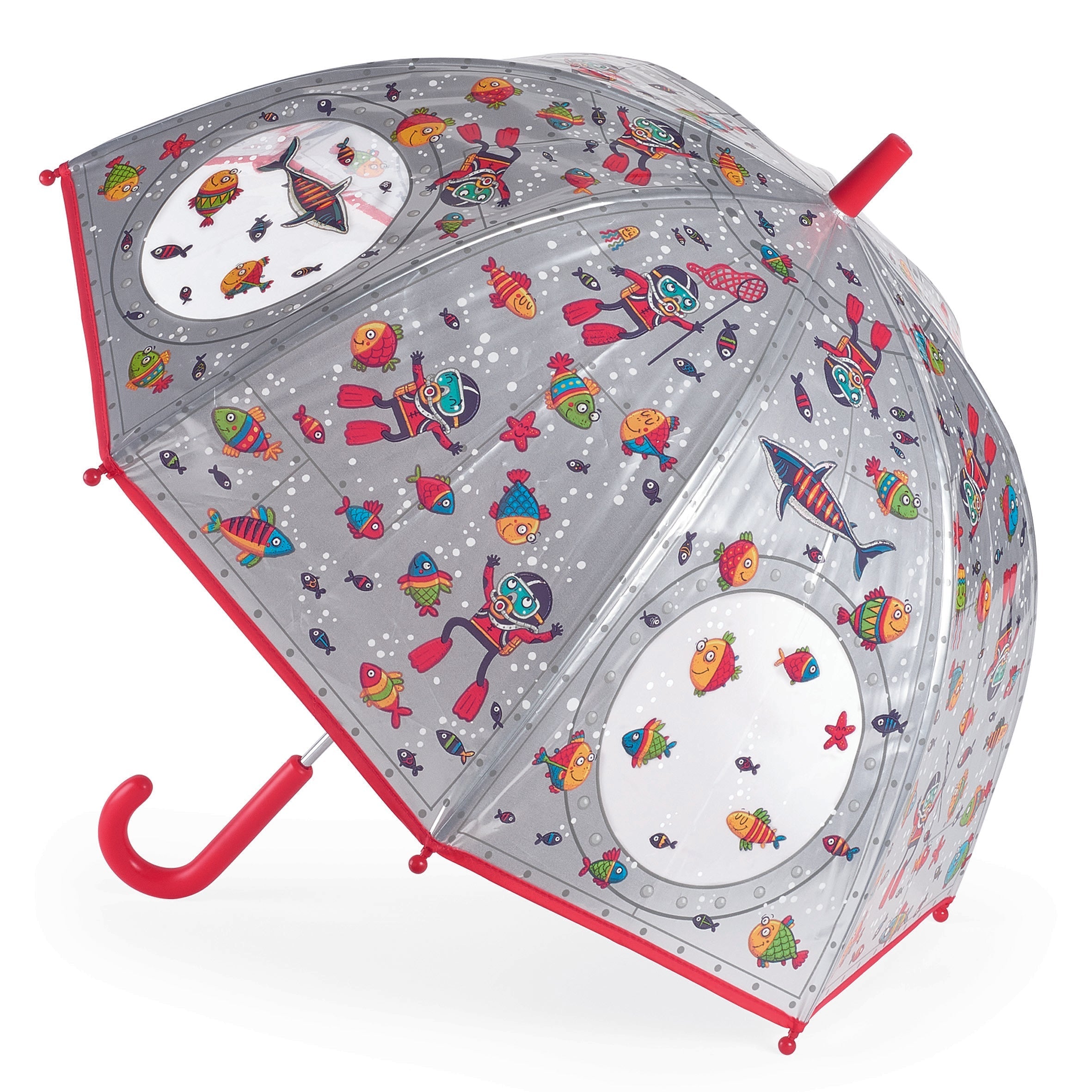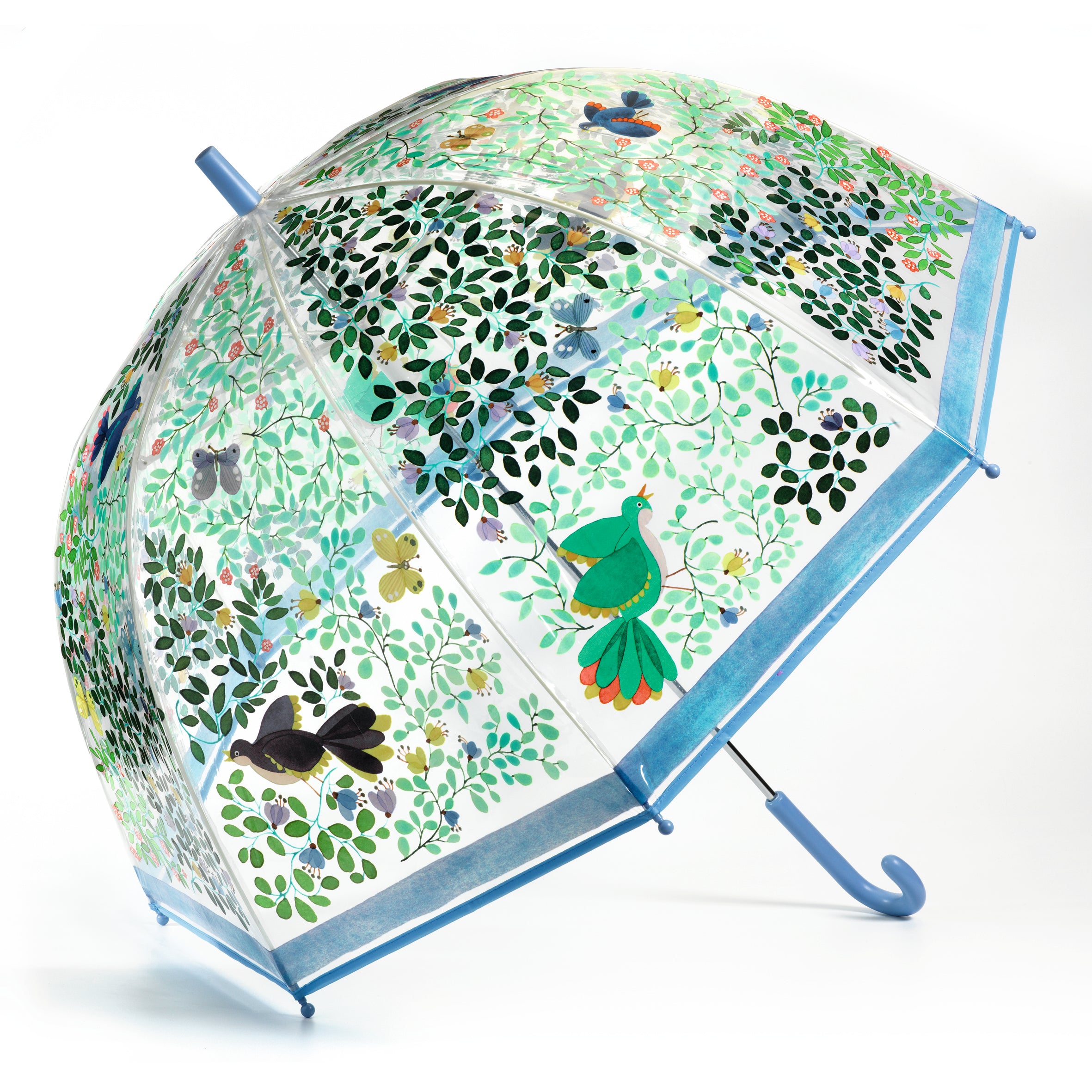 An umbrella in soft colours. Its transparent design enables the child to see where he or she is going, and its manual opening fitted with a protection system meaning that it can be opened and closed without pinching your fingers. A colourful accessory, ideal for brightening up outings in the rain!