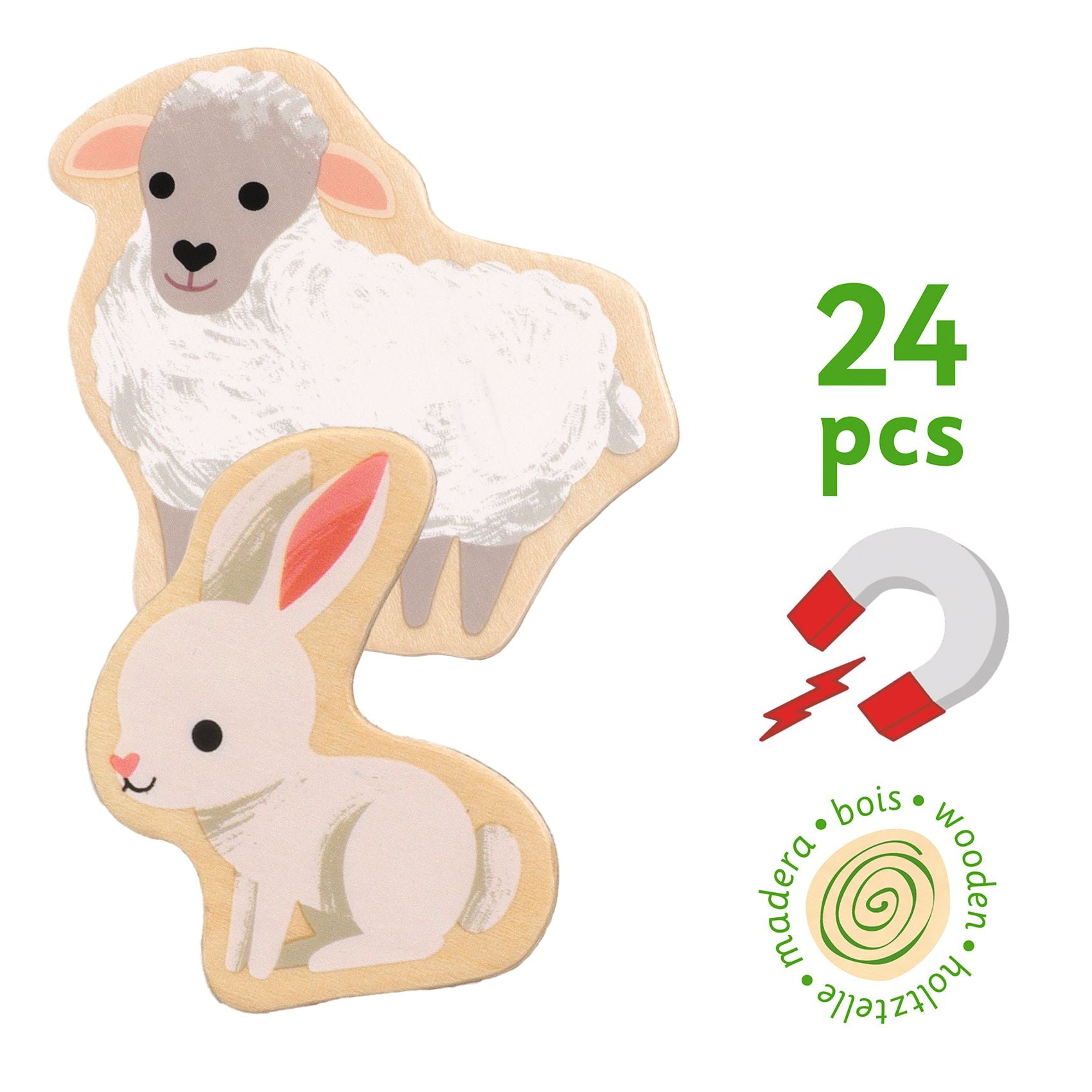 A set of 24 farm-themed magnetic wooden pieces.