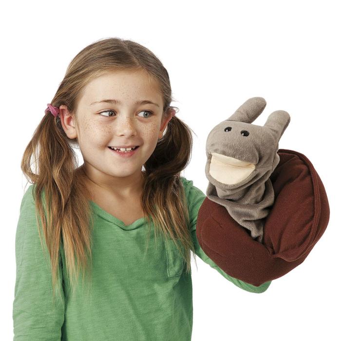 • Slower than most puppets, but full of character — the Folkmanis® Snail hand puppet brings a charming, low‑key presence to playtime. Its soft, velvety grey “body” and spiral brown shell feel gentle and tactile, while the expressive antennae and movable mouth let you bring the snail to life with a surprising range of emotion.