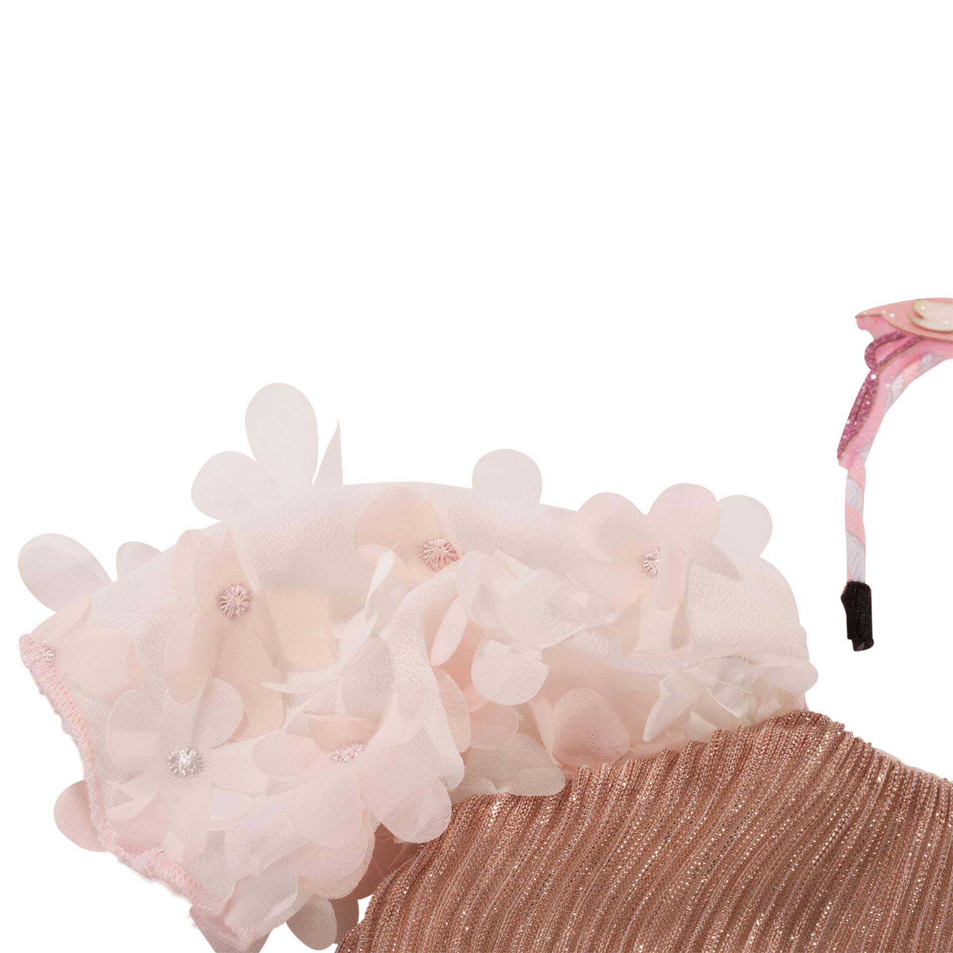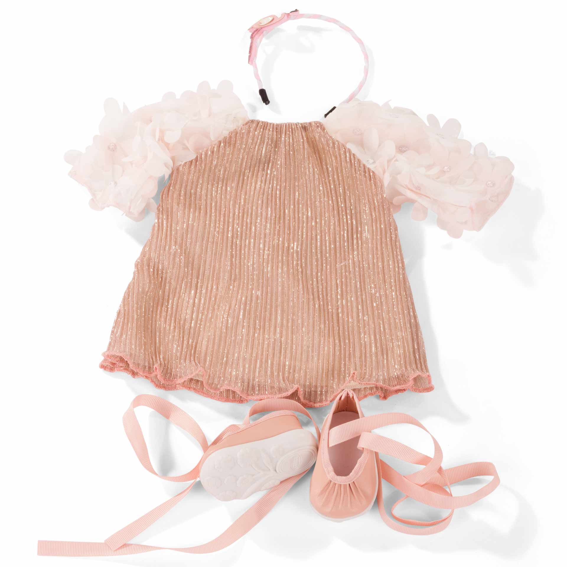 Do you have a party coming up and your doll doesn’t have a really great outfit? With this set she’ll be perfectly dressed. An extravagant summer set with shimmering pleated dress with lots of flowers on the sleeves and matching ballet pumps to tie according to preference. The highlight is the hair bow with flamingo in your hair - what a chic style!