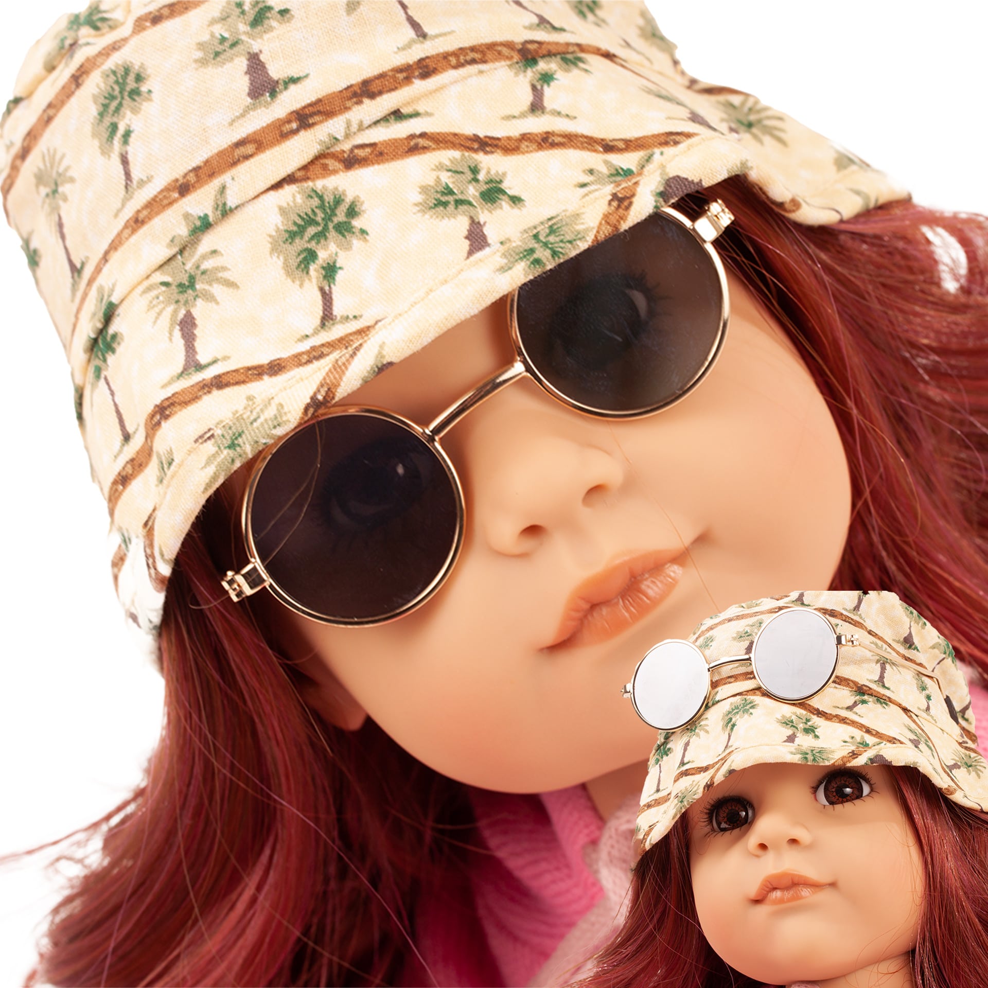 What a great basic must have set for sunny days. A nice hat with palm trees allover and cool sunglasses. Your doll will love it!