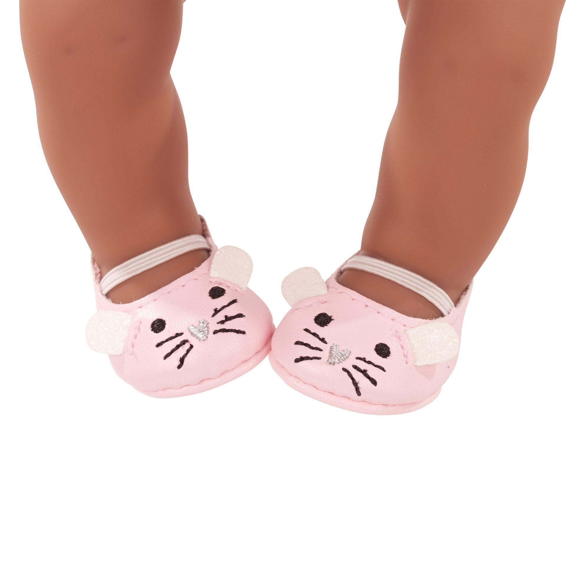 • A really sweet little pair of shoes with a mouse design. The glittery yarn makes the little ears and nose glitter. These shoes have a light sole and an elasticated band to keep them on. Your doll is sure to love them and will be happy to show them off during her next outing.