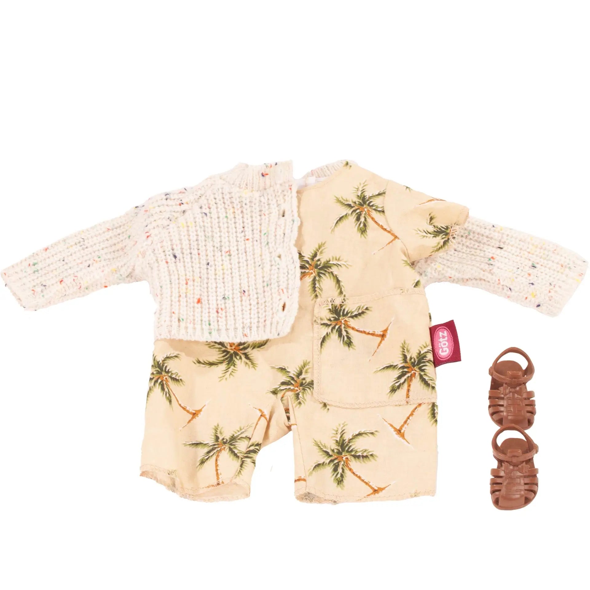 A summerly and light jumpsuit with palm tree prints and pocket in the front. Simply comfy and very chic and in case it's getting cold just put on this colourfully mottled knitted cardigan for longer outside play fun. What a perfect set for the summertime!