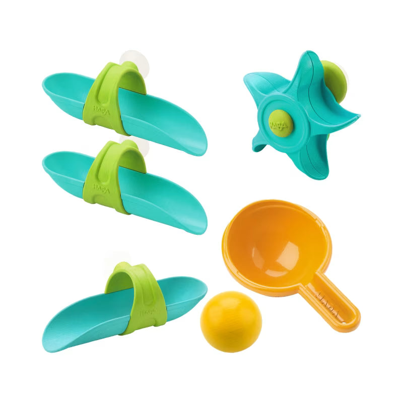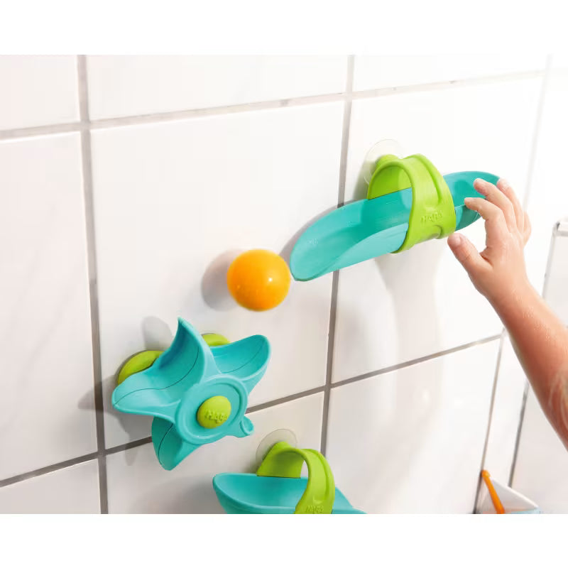 HABA’s Bathing Fun marble run turns bath time into a splashy adventure. Kids can stick the tracks and paddle wheel onto bathroom tiles with suction cups, rearranging them endlessly as the ball zips through the course and splashes into the tub. With flexible setup, a ladle for extra water play, and compatibility with all Bathing Fun parts, this set encourages creativity, experimentation, and joyful splashing.