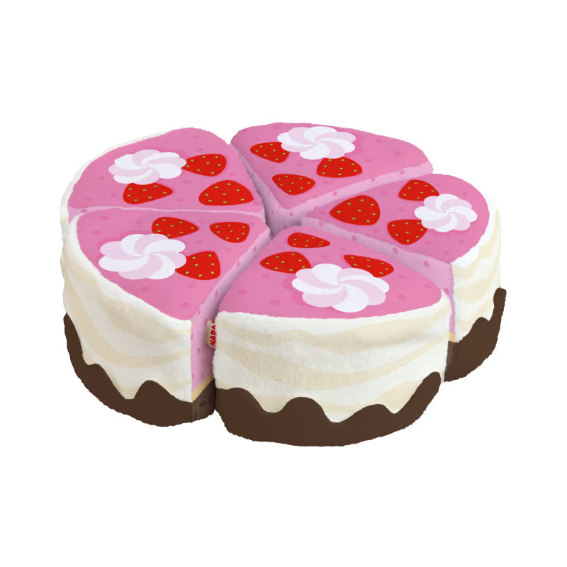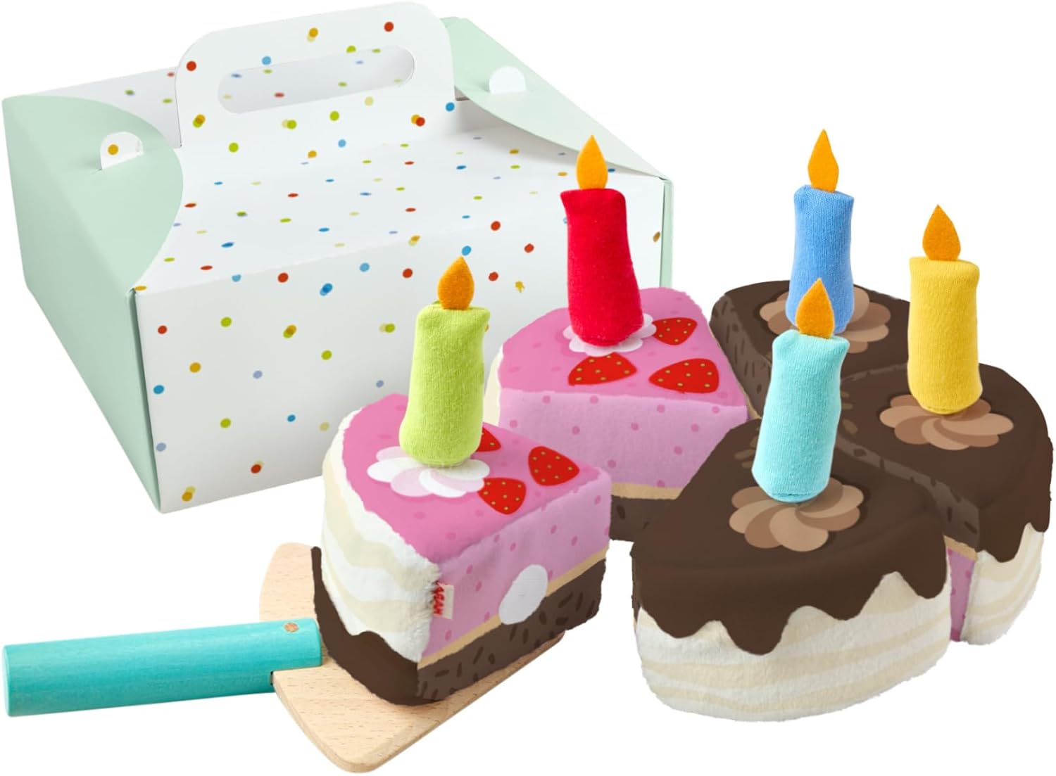This lovingly designed fabric birthday cake with five candles will make any celebration a highlight! The cake comes in a decorative cake box and can be "cut" into individual slices thanks to the Velcro fasteners. The matching wooden cake server allows little bakers to serve their creations in style. Perfect for imaginative role-playing birthday parties and for developing fine motor skills.