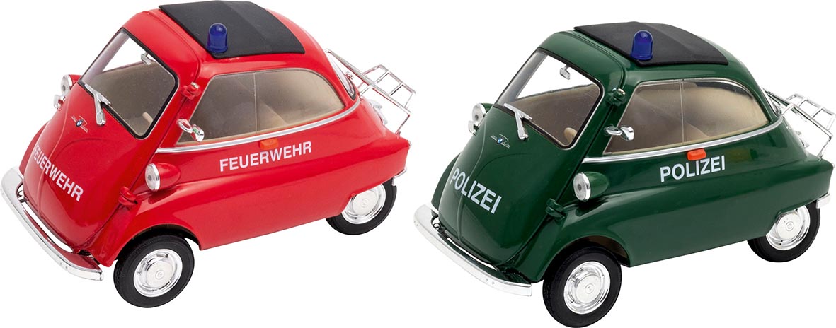 The Goki Die-Cast Pull-Back BMW Isetta Police Car and Fire Brigade are charming miniature replicas of the classic BMW Isetta — reimagined in emergency service designs! Each car is crafted from durable die-cast metal and features a pull-back motor for fast, friction-powered action. Built at an approximate 1:64 scale, these vehicles combine nostalgic design with playful fun. Perfect for imaginative rescue missions or as collectible display pieces.
