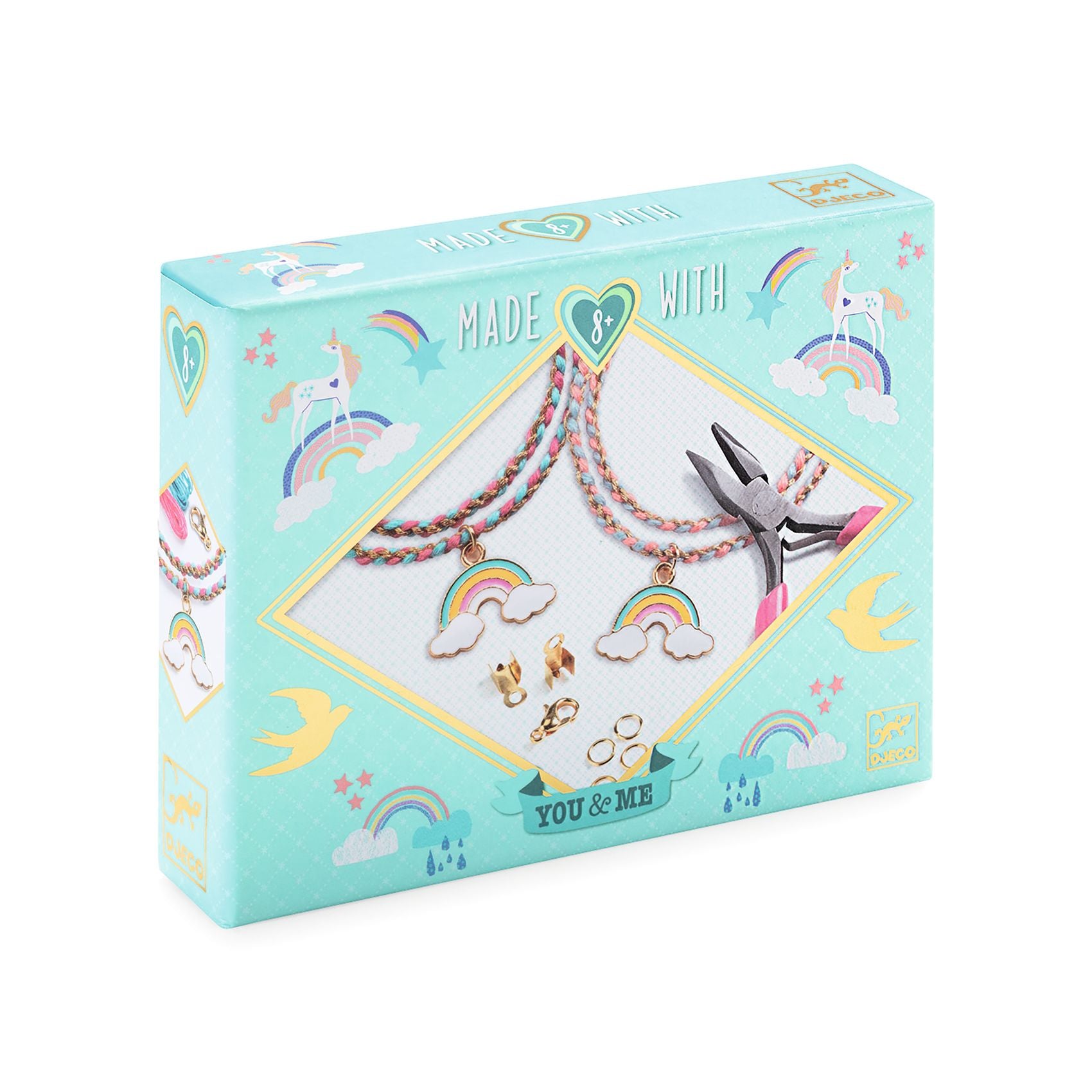 In a pretty shiny box, an assortment of beads and charms for creating two fashionable bracelets. Two jewels to keep for yourself or to give as gifts in a pretty organza bag. And for even more memories, two picture cards are included for writing love notes.