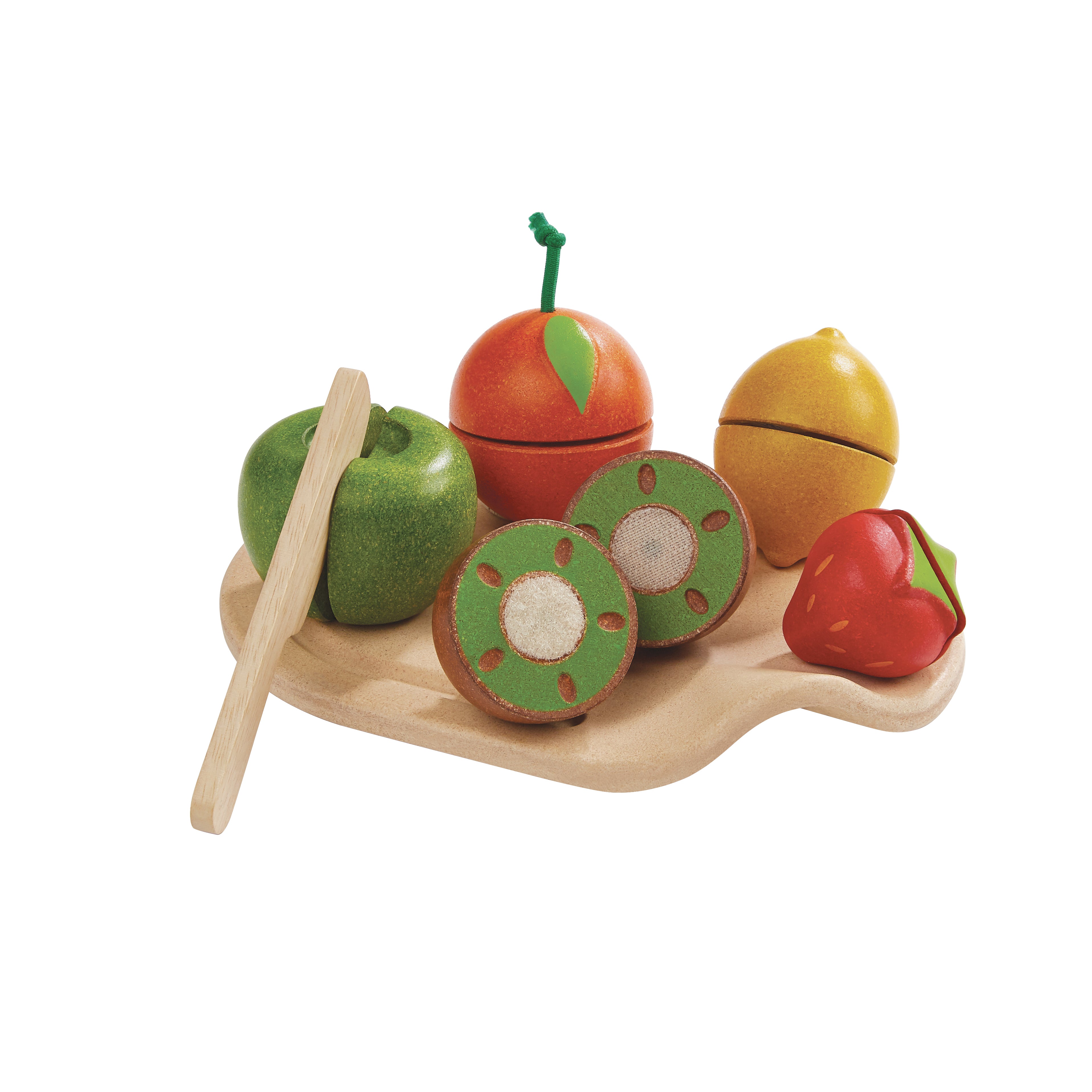 - The set includes 1 orange, 1 lemon, 1 kiwi, 1 strawberry, 1 apple, 1 knife, and a cutting board