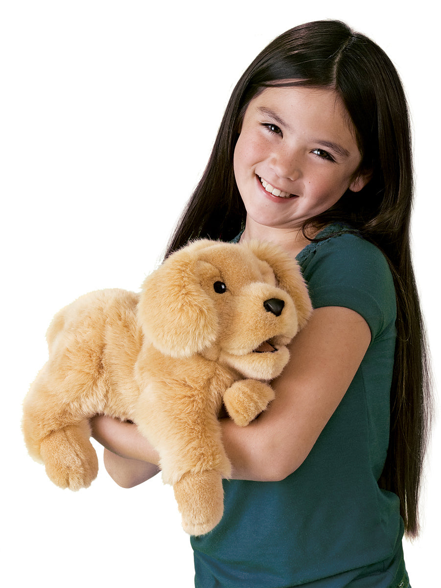 Bring home the warmth and loyalty of a beloved companion with the Folkmanis® Golden Retriever Puppy hand puppet. This lifelike puppet is crafted from soft golden plush that mimics a real retriever’s fur and features soulful black eyes that give it an affectionate, friendly expression.