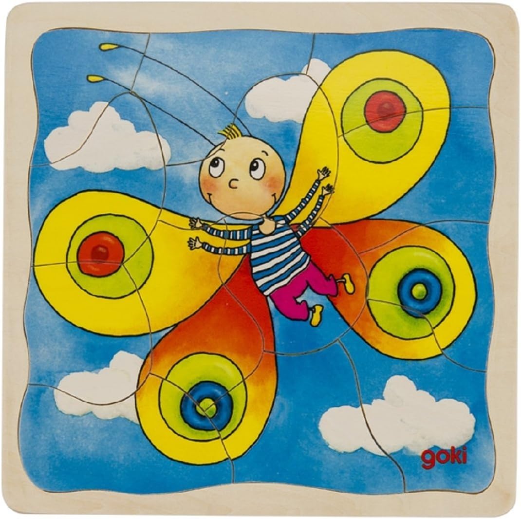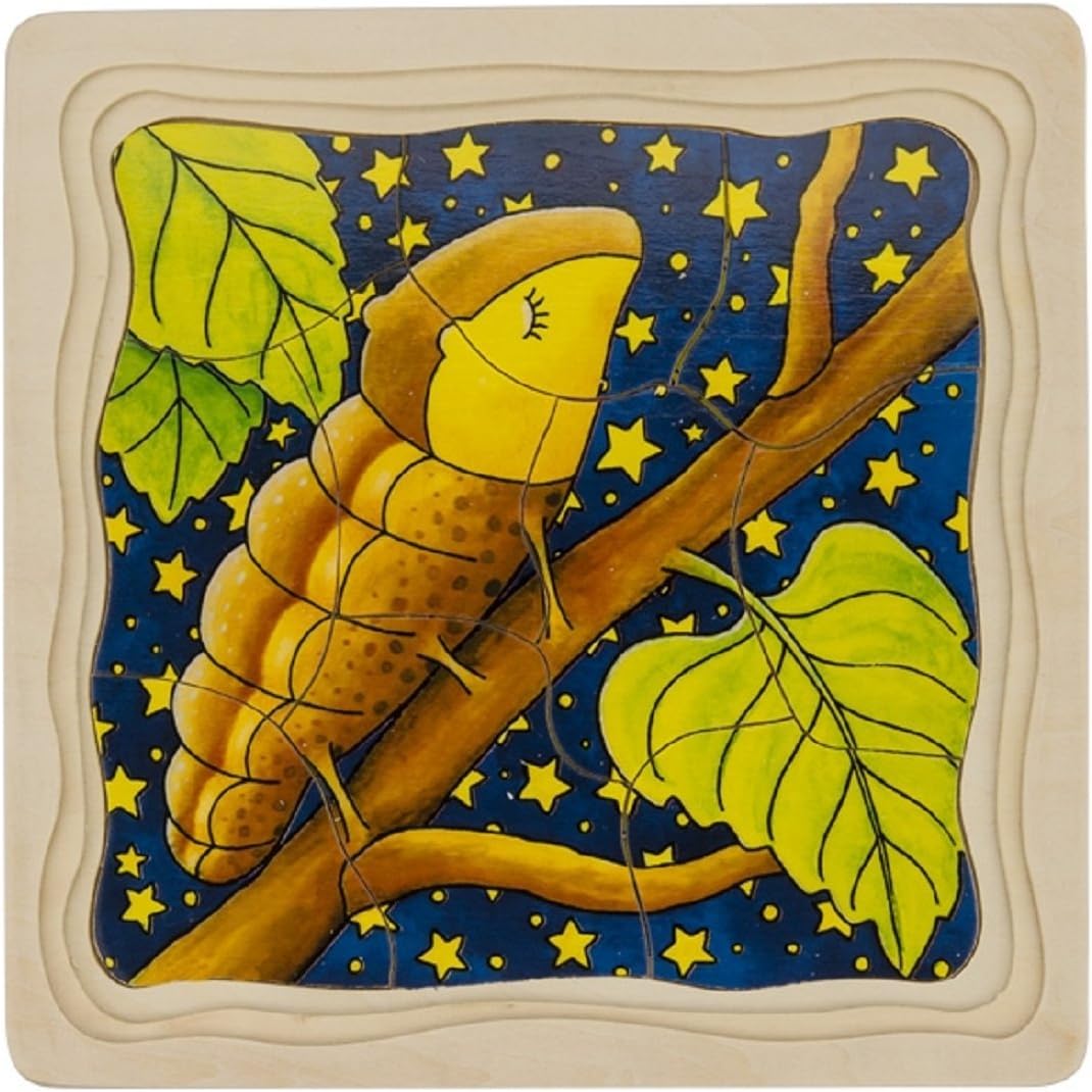 A layered wooden puzzle that illustrates the life cycle of a caterpillar → pupa → butterfly, through four stacking puzzle layers. A lovely educational toy to develop fine motor skills, sequencing, spatial reasoning, and reinforce nature & biology concepts.