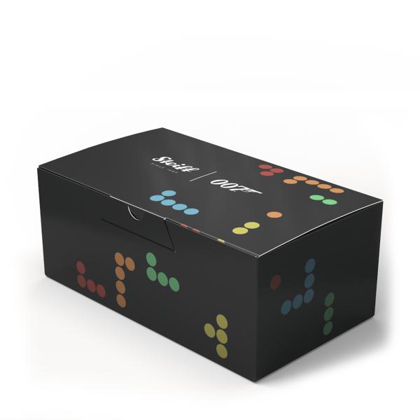 Bond, James Bond. This unique musical Teddy bear plays one of the most recognisable tunes in the world, the iconic 007 theme tune. A true leading man, our Bond bear is dressed to impress in his mohair dinner jacket with perfectly fitting bow tie. His left sole is adorned in striking red with an embroidered 007 and Dr. No logo as a tribute to the first film in the series (1962). © EMI United Partnership Ltd. o/b/o Norman Monty.