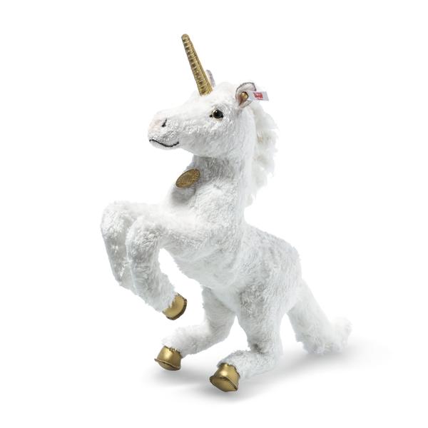 The unicorn is not only the emblem of Margarete Steiff’s hometown Giengen, but also a fascinating character that has inspired people’s imaginations for centuries. This majestic rearing unicorn thus combines tradition and fairytale in itself, his radiant white mane and golden horn complement each other to create an elegant overall image. With plush made from alternatively produced material of woven soy bamboo viscose, the new unicorn is ready to gallop into the future.