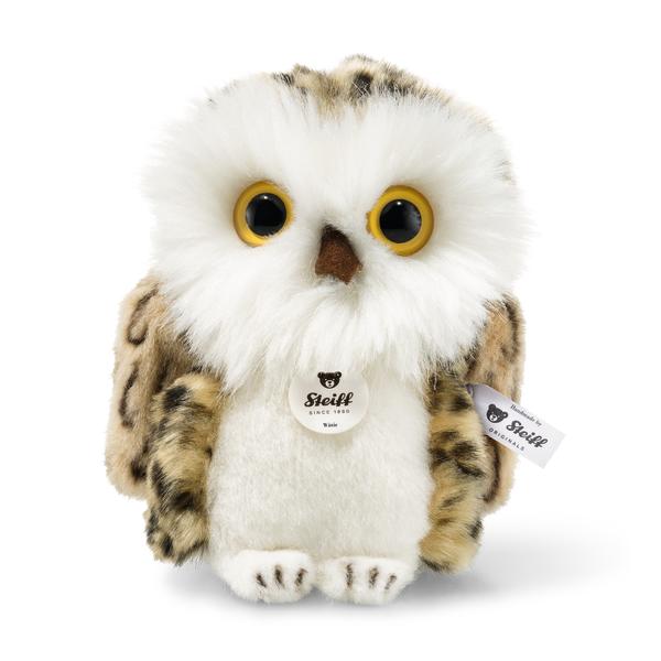 Wittie owl measures 12 cm and has grey brindled feathering made of cuddly soft woven fur. Wittie is machine washable at 30°C. Wittie is a joy for all Steiff fans, both young and old.