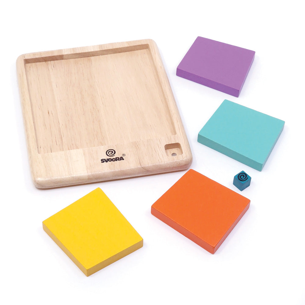 This puzzle features 5 wooden pieces—4 large and 1 small—that must fit perfectly into a square frame without gaps or overlaps.