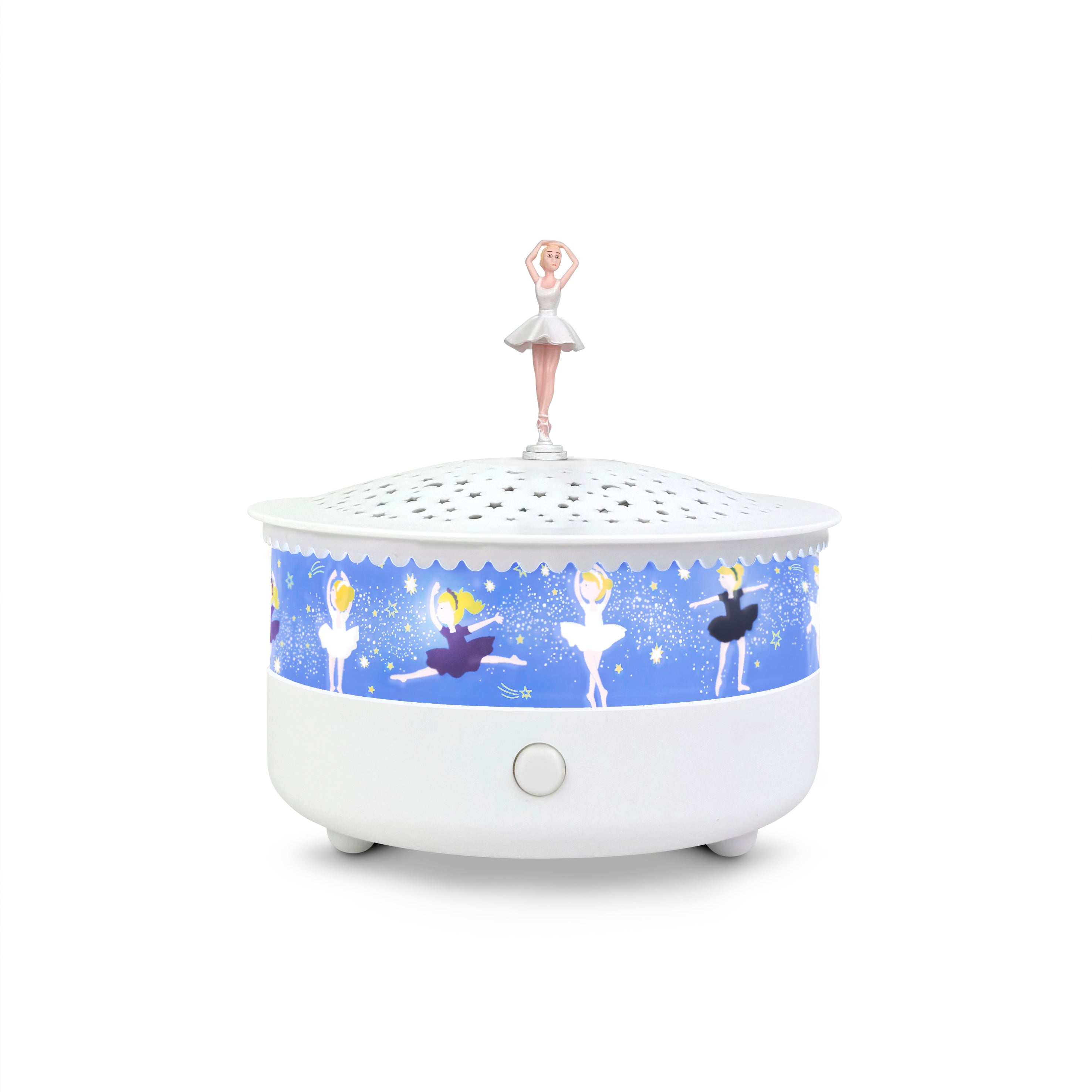 The figure atop the projector rotates gently when the music is activated, adding a dynamic element to the projection.