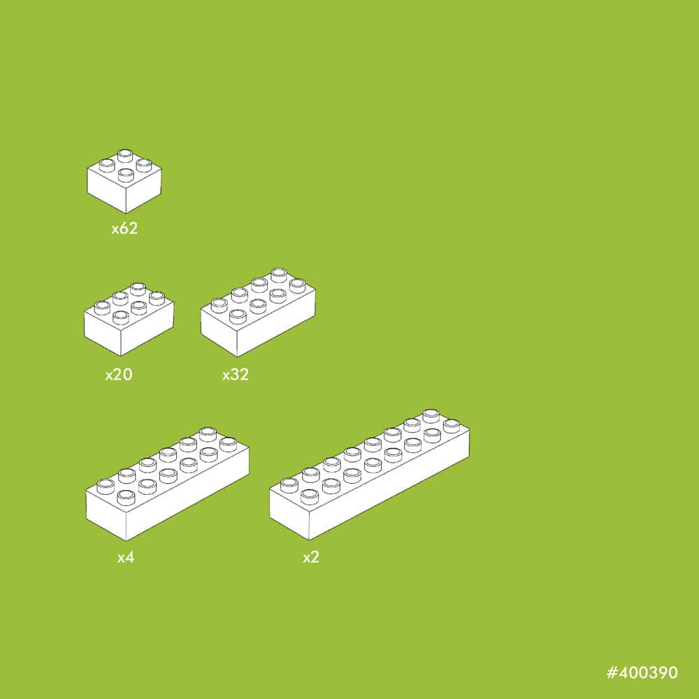 Content: 120 pieces (62 2×2 building blocks, 20 2×3 building blocks, 32 2×4 building blocks, 4 2×6 Building blocks and 2 2×8 building blocks)
